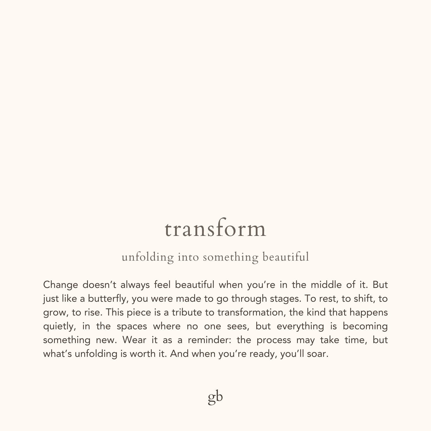 Change doesn’t always feel beautiful when you’re in the middle of it. But just like a butterfly, you were made to go through stages. To rest, to shift, to grow, to rise. This piece is a tribute to transformation, the kind that happens quietly, in the spaces where no one sees, but everything is becoming something new. Wear it as a reminder: the process may take time, but what’s unfolding is worth it. And when you’re ready, you’ll soar.