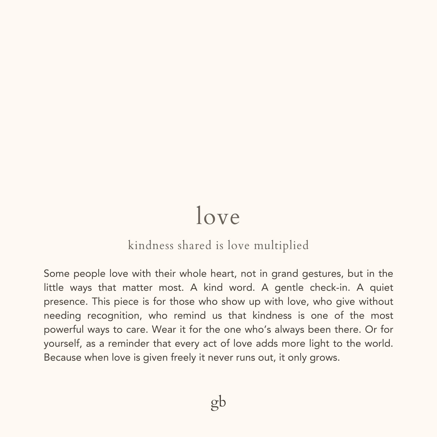 Some people love with their whole heart, not in grand gestures, but in the little ways that matter most. A kind word. A gentle check-in. A quiet presence. This piece is for those who show up with love, who give without needing recognition, who remind us that kindness is one of the most powerful ways to care. Wear it for the one who’s always been there. Or for yourself, as a reminder that every act of love adds more light to the world. Because when love is given freely it never runs out, it only grows.