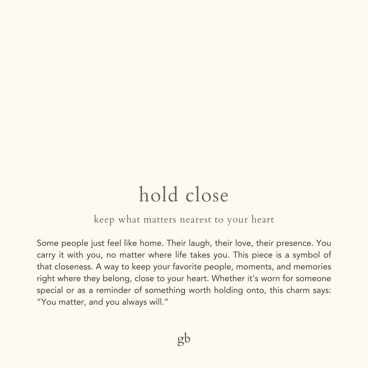 Some people just feel like home. Their laugh, their love, their presence. You carry it with you, no matter where life takes you. This piece is a symbol of that closeness. A way to keep your favorite people, moments, and memories right where they belong, close to your heart. Whether it’s worn for someone special or as a reminder of something worth holding onto, this charm says: “You matter, and you always will.”
