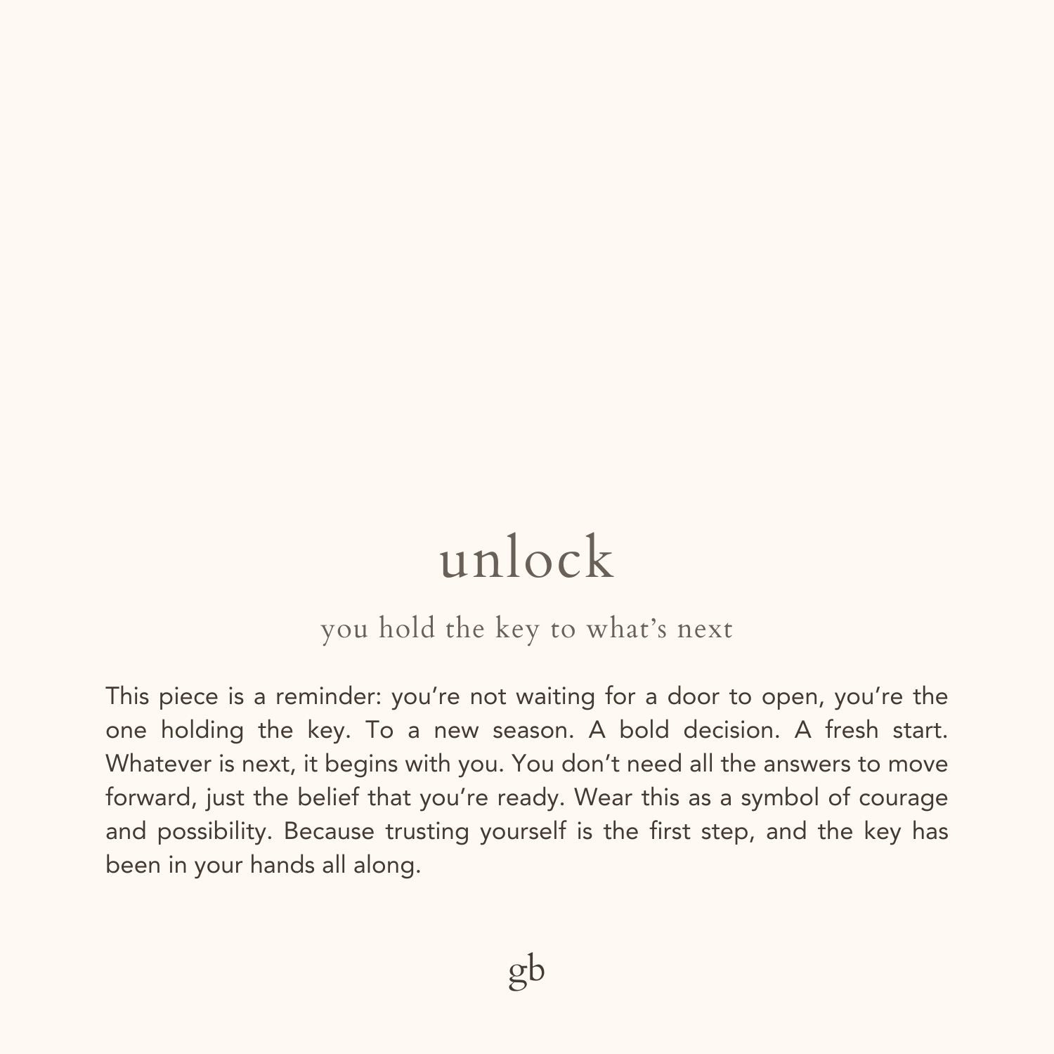 This piece is a reminder: you’re not waiting for a door to open, you’re the one holding the key. To a new season. A bold decision. A fresh start. Whatever is next, it begins with you. You don’t need all the answers to move forward, just the belief that you’re ready. Wear this as a symbol of courage and possibility. Because trusting yourself is the first step, and the key has been in your hands all along.
